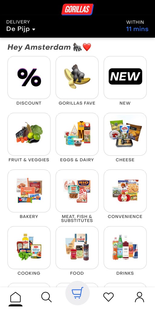 Outro similar que é uma novidade é o Gorillas, um app de delivery mas com o diferencial de que eles entregam as compras em cerca de 10 minutos do pedido! É surreal de rápido, mas eles ainda estão expandindo as operações, e por enquanto só estão em algumas regiões de Amsterdam. Ah, e eles cobram uma taxa de entrega de €1,80, o que não é um valor proibitivo.