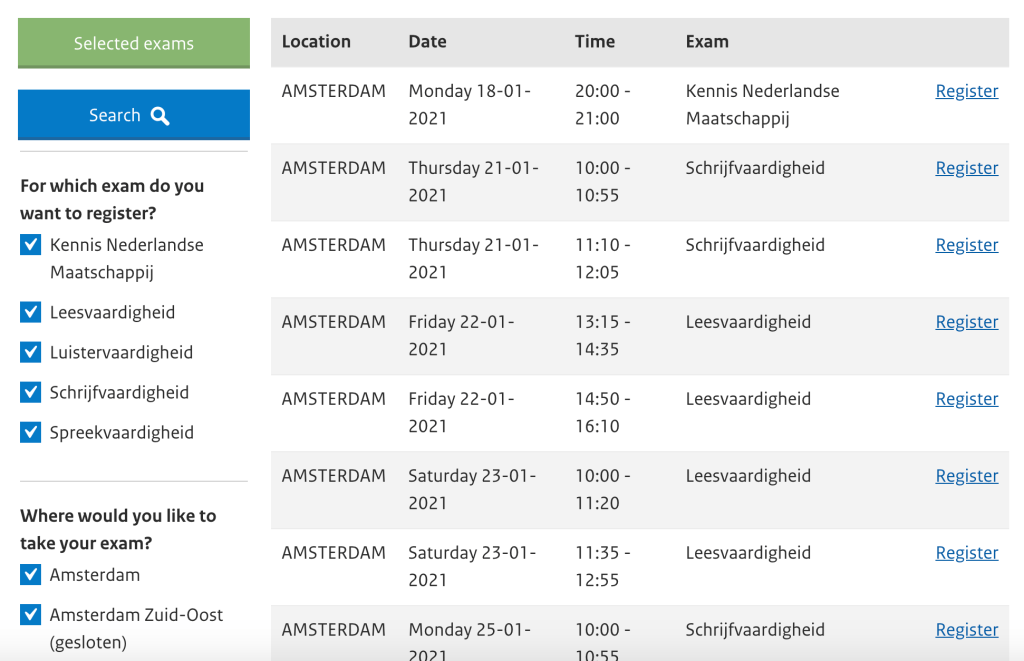 Para agendar, é só fazer seu login no Mijn Inburgering (site oficial do governo com todas as informações do seu trajeto de integração) e clicar em Register/Modify Exams.