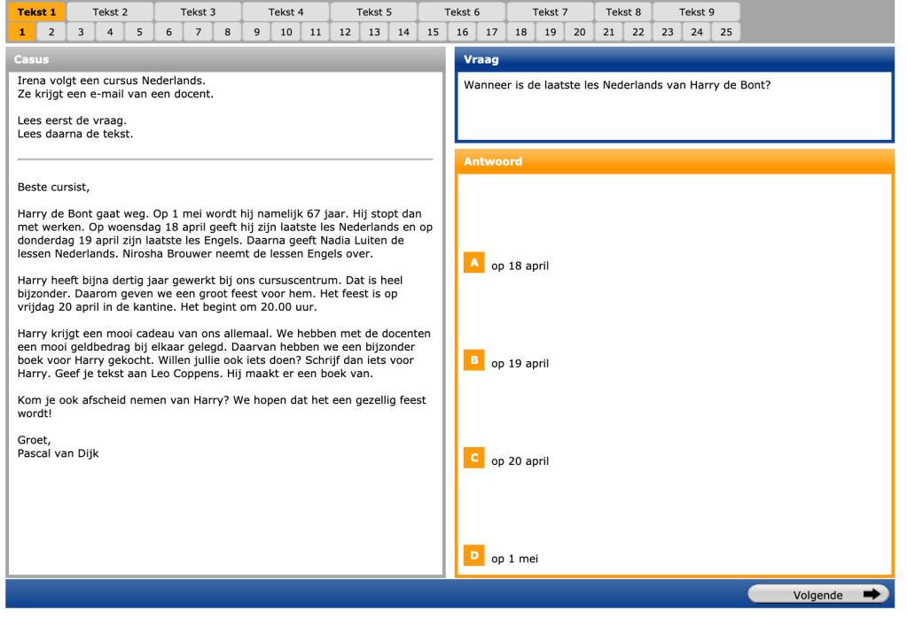 Aqui não tem muito conhecimento pra estudar e aprender, é mais a prática de interpretação de texto e ter o vocabulário e entendimento suficiente pra saber do que o texto está falando e como encontrar a resposta correta no texto. O meu costume de ler notícias em holandês também me ajudou indiretamente na preparação pra essa prova.